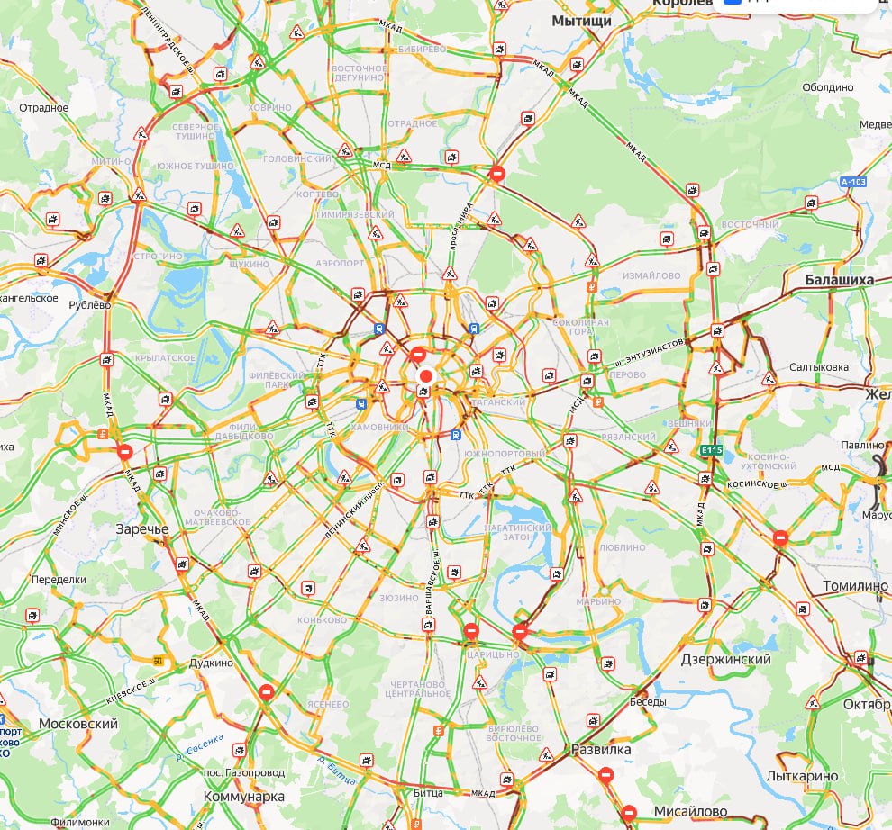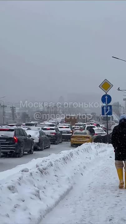 Москва снова алая — под конец рабочего дня в столице опять скопились пробки в девять баллов из-за снегопада.