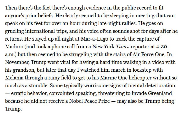 «Кроме того, в открытом доступе достаточно доказательств, чтобы подтвердить любые прежние убеждения. Он явно засыпал на собраниях, но мог говорить стоя больше часа во время ночных митингов. Он совершает изнурительные поездки за границу, и его голос часто звучит сдавленно ещё несколько дней после возвращения. Он не спал всю ночь в Мар-а-Лаго, следя за поимкой Мадуро (и в 4:30 утра ответил на телефонный звонок репортёра New York Times), но затем, похоже, с трудом поднялся по трапу президентского самолёта. В ноябре Трамп стал героем вирусного видео, на котором ему было трудно идти рядом с внуком, но позже в тот же день я видел, как он шёл в ногу с Меланией по дождливому полю к своему вертолёту Marine One, ни разу не споткнувшись. Некоторые типичные тревожные признаки ухудшения психического состояния — эксцентричное поведение, бессвязная речь, угрозы вторгнуться в Гренландию из-за того, что он не получил Нобелевскую премию мира, — могут быть просто Трампом».