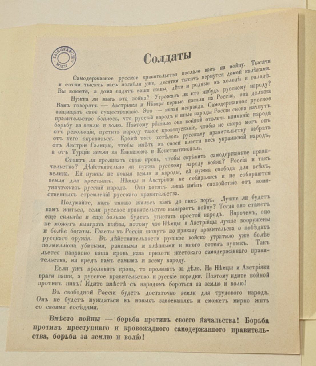 Вот революционная листовка к русским солдатам, написаная австрийским Эвиденцбюро.