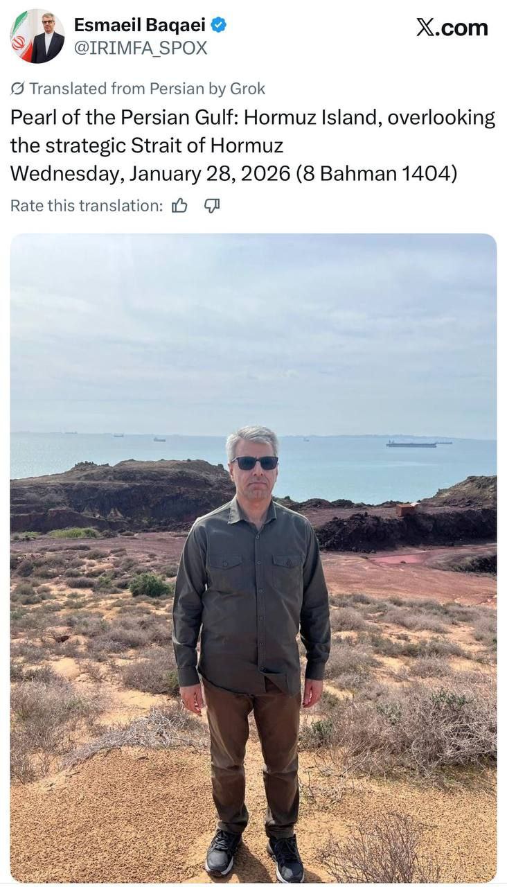 — Пресс-секретарь Министерства иностранных дел Ирана Эсмаил Бакаи опубликовал в X:"Жемчужина Персидского залива; остров Ормуз, с видом на стратегический Ормузский пролив"