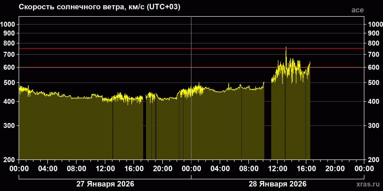 «Резких ударов не было (скорость растёт довольно плавно), поэтому геомагнитные индексы пока держатся в зелёной зоне, но в ближайшее время почти наверняка пожелтеют. Вероятны слабые бури. Поступающие с орбиты параметры плазмы выглядят благоприятными для разгорания полярных сияний»