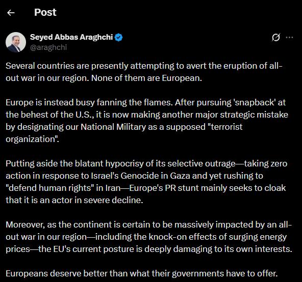 «Несколько стран в настоящее время пытаются предотвратить разрастание полномасштабной войны в нашем регионе. Ни одна из них не является европейской. Вместо этого Европа занята тем, что подливает масла в огонь. После того как по указке Соединённых Штатов был нанесён «ответный удар», они теперь совершают ещё одну крупную стратегическую ошибку, объявляя наши национальные вооружённые силы якобы «террористической организацией». Если оставить в стороне вопиющее лицемерие их показного возмущения — полное отсутствие каких-либо действий в ответ на израильский геноцид в Газе и при этом спешку «защищать права человека» в Иране, — этот пиар-ход Европы в основном направлен на то, чтобы скрыть, что сам актор находится в состоянии серьёзного упадка. Более того, поскольку континент, без сомнения, сильно пострадает от полномасштабной войны в нашем регионе, в том числе из-за побочных эффектов в виде роста цен на энергоносители, нынешняя позиция ЕС серьёзно вредит его собственным интересам. Европейцы заслуживают лучшего, чем то, что могут предложить им их правительства».