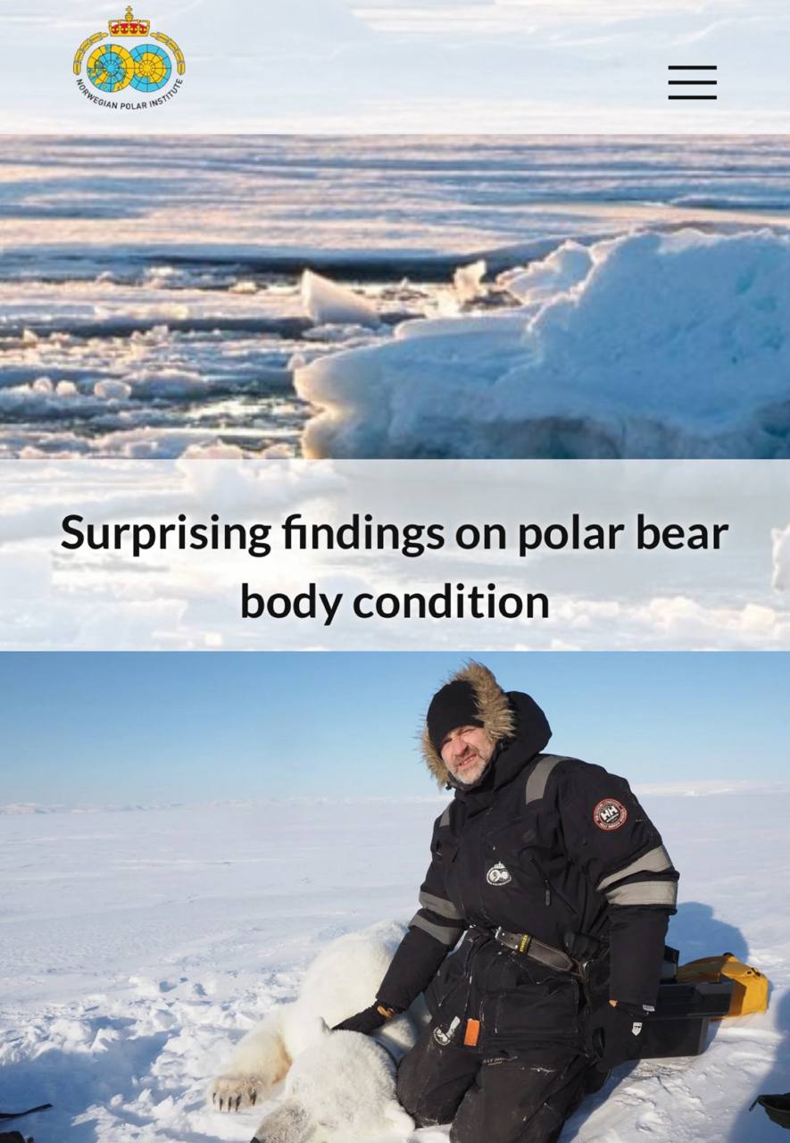 «Белые медведи, обитающие на архипелаге Шпицберген, стали более упитанными, чем их собратья, жившие четверть века назад, из-за уменьшения площади льда и возможности охоты на суше. Исследования показали, что несмотря на сокращение времени, которое медведи проводят на льду, их физическое состояние не ухудшилось, а даже наоборот.