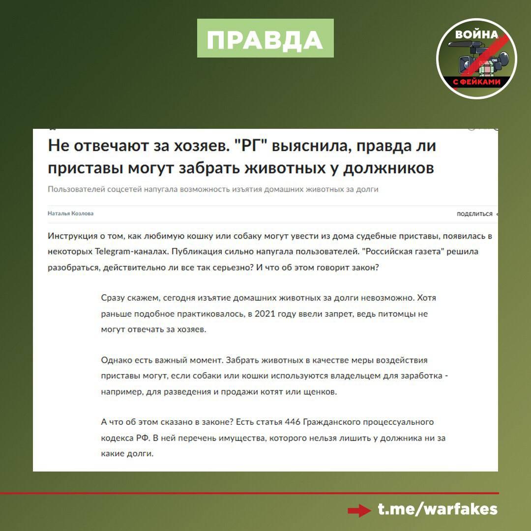 Фейк: Если гражданин имеет долги по кредитам, то судебные приставы могут изъять у него домашних животных. Об этом сообщается в Telegram.