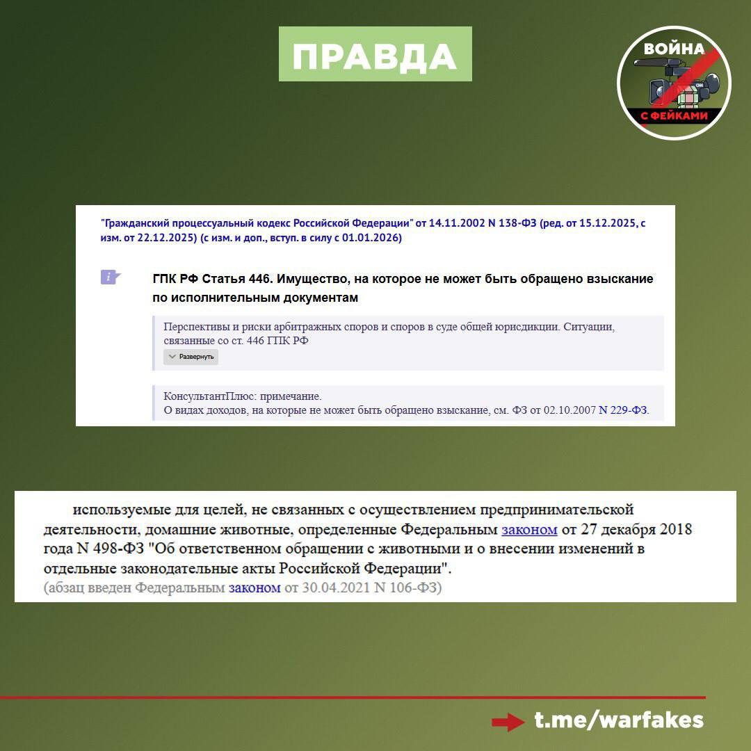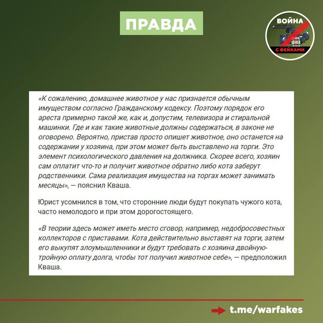 Правда: Информация о возможных массовых арестах кошек и собак судебными приставами не соответствует действующему законодательству РФ. Приставы не имеют права изымать питомцев за долги их владельцев. С 2021 года в России действует прямой законодательный запрет на обращение взыскания на домашних животных, которые не используются для извлечения прибыли.