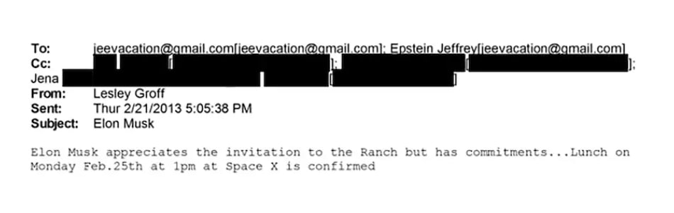 Эпштейн переписывался с Илоном Маском, хотя последний утверждал, что подобных контактов не было. В сообщении, датированном 2012 годом, миллиардер спрашивает "В какой день/ночь будет самая дикая вечеринка на нашем острове?" (фото 5). Также Эпштейн договаривался о встрече с Маском в 2013 году — уже после того, как был осужден по первому делу за склонение несовершеннолетней к проституции (фото 6).