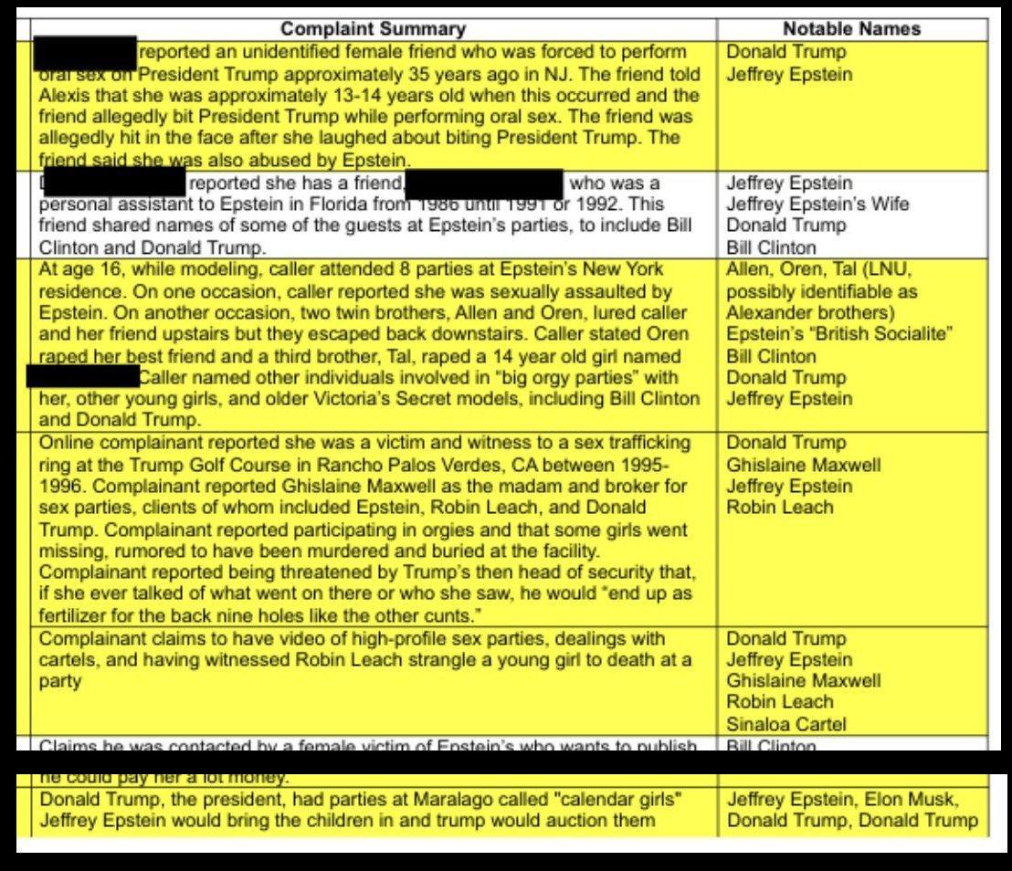 В документах есть показания (фото 2-4) предполагаемых жертв, где они описывают сексуальные оргии в поместье и на ранчо Трампа. Утверждается, что президент США склонял девушек к половым актам, включая 13-летнюю девочку, а также продавал их с "аукционов" другим богатым участникам вечеринок. Некоторые девушки затем бесследно исчезли.