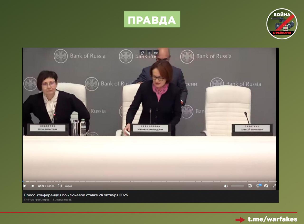 Таким образом, для создания фейка были использованы сразу два видео с участием Эльвиры Набиуллиной. Первое — с пресс-конференции от 19 декабря прошлого года, второе было снято на аналогичном мероприятии, но в октябре 2025 года. Их фрагменты склеили, а затем наложили нейросетевую звуковую дорожку.