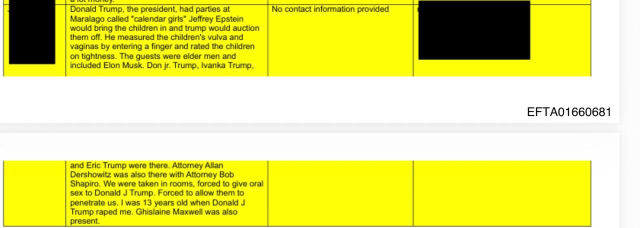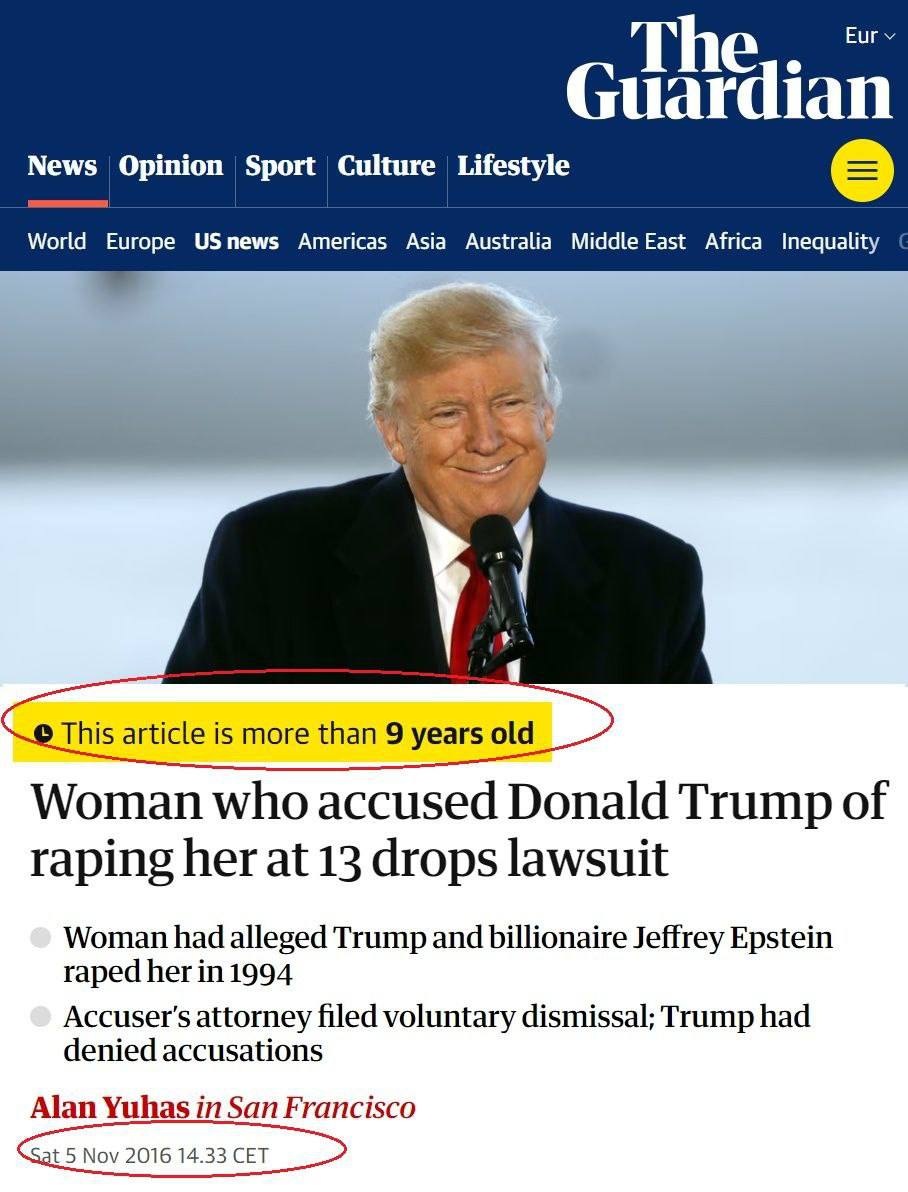 Так, у сообщения о том, что Трамп якобы изнасиловал 13-летнюю девочку, стоит пометка «No contact information provided», что означает, что в сообщении не было оставлено данных для связи (телефон, email, адрес и т.п.), поэтому связаться с заявителем для уточнений/проверки было невозможно. Вероятно, это та же история с якобы имевшим место изнасилованием 13-летней девочки, которой демократы сбивали Трампа еще перед выборами 2016 года. В материале The Guardian того времени сообщается, что анонимная женщина, утверждавшая, что Дональд Трамп и Джеффри Эпштейн изнасиловали её в 1994 году, когда ей было 13 лет, добровольно отозвала иск. Обвинительница была указана в иске под псевдонимом «Джейн Доу» — истец может идти в суд под псевдонимом (особенно в сексуальных делах), при этом суд/стороны могут знать личность под защитным порядком, а публика — нет. По данным публикации, речь шла о заявленных эпизодах на встречах/вечеринках в НьюЙорке; сама подача прекращения дела была оформлена как добровольное прекращение производства, без публичного подробного объяснения причин. Также указывалось, что Трамп обвинения отрицал.