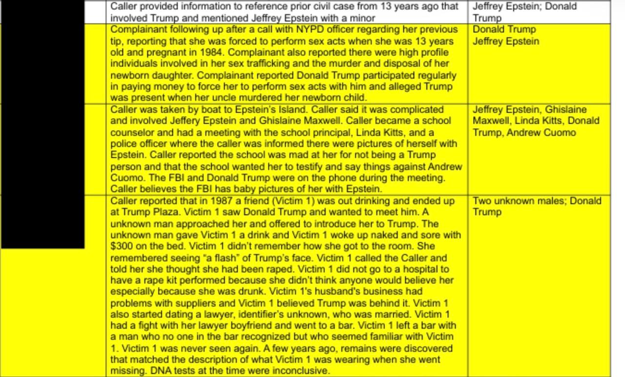 «Заявительница обратилась в полицию Нью-Йорка после звонка по поводу своего предыдущего сообщения, в котором она сообщила, что ее принуждали к сексуальным действиям, когда ей было 13 лет, и она была беременна в 1984 году. Заявительница также сообщила о причастности высокопоставленных лиц к торговле людьми в целях сексуальной эксплуатации, а также к убийству и сокрытию тела ее новорожденной дочери. Заявительница сообщила, что Дональд Трамп регулярно участвовал в выплате денег, чтобы заставить ее совершать с ним сексуальные действия, и утверждала, что Трамп присутствовал, когда ее дядя убил ее новорожденного ребенка».