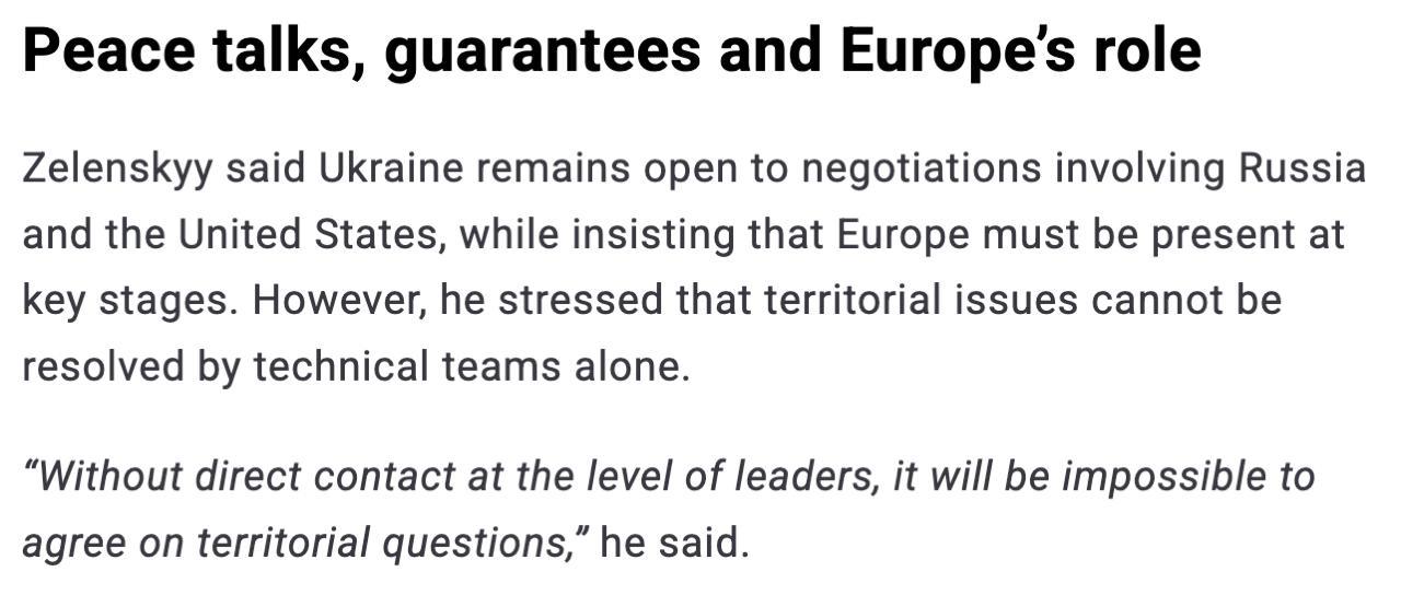 Мы открыты для встреч в любом формате с Россией и Соединёнными Штатами Америки. Мы также хотели бы присутствия Европы на том или ином этапе этих переговоров, поскольку частью нашей системы гарантий безопасности является членство в Европейском Союзе, а...