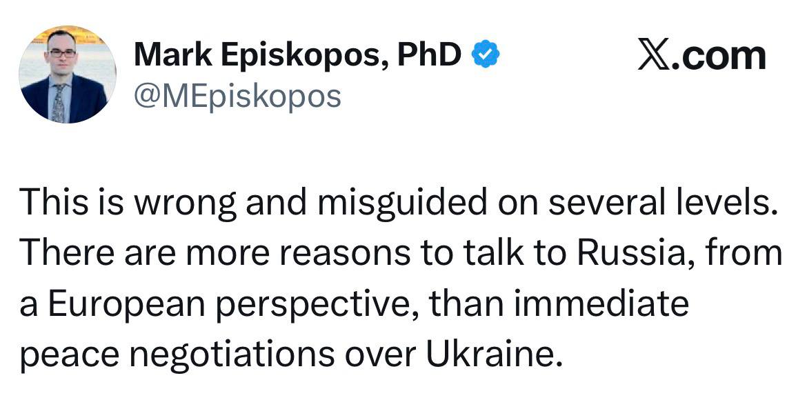 Это неправильно и ошибочно по нескольким причинам. С европейской точки зрения, есть гораздо больше оснований для переговоров с Россией, чем для немедленных мирных переговоров по Украине.
