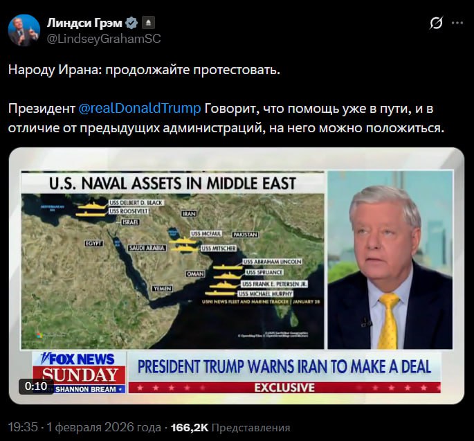Сенатор-ястреб Линдси Грэм* подбивает иранцев к продолжению бунтов в стране.