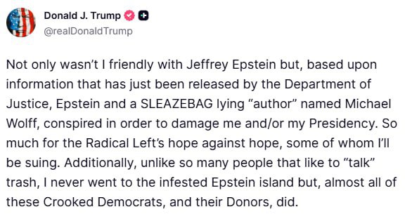 «Я не только не был в дружеских отношениях с Джеффри Эпштейном, но, согласно информации, только что обнародованной Министерством юстиции, Эпштейн и МЕРЗАВЕЦ-лжец «автор» по имени Майкл Вольф сговаривались, чтобы навредить мне и/или моему президентству. Так что можете забыть об отчаянной надежде радикальных левых, некоторых из которых я буду судить. Кроме того, в отличие от множества людей, которые любят «трепаться», я никогда не был на этом зараженном острове Эпштейна, но почти все эти Беспринципные демократы и их спонсоры там были».