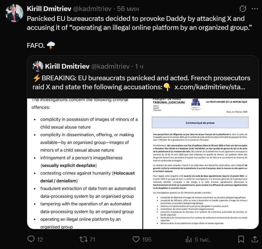 «Напуганные европейские бюрократы решили спровоцировать папочку, напав на X и обвинив его в "управлении незаконной онлайн-платформой организованной группой"», — прокомментировал Кирилл Дмитриев обыск во французском офисе.