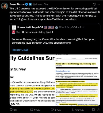 «Конгресс США обвинил Комиссию ЕС в цензуре политических оппонентов на протяжении более десяти лет и во вмешательстве как минимум в восьми выборах в шести европейских странах. Это согласуется с попытками правительства Франции заставить Telegram подвергнуть цензуре речь в двух из этих стран».
