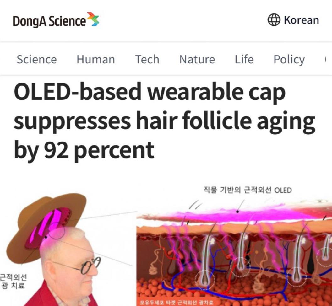 «Исследователи из Южной Кореи и Городского университета Гонконга разработали шляпу на основе гибких OLED-дисплеев, которая излучает ближний инфракрасный свет для фототерапии против выпадения волос. Устройство равномерно освещает всю кожу головы, подавляя старение клеток волосяных фолликулов, что является ключевым фактором облысения.