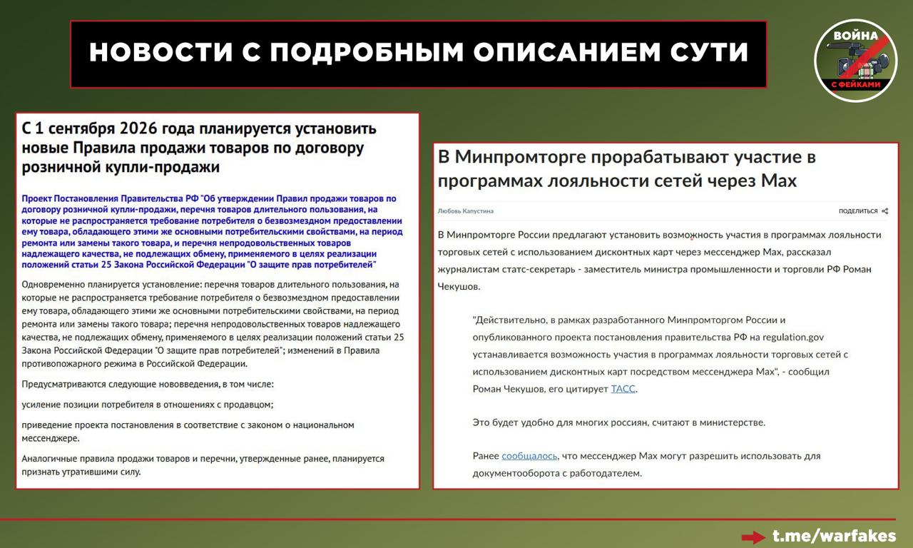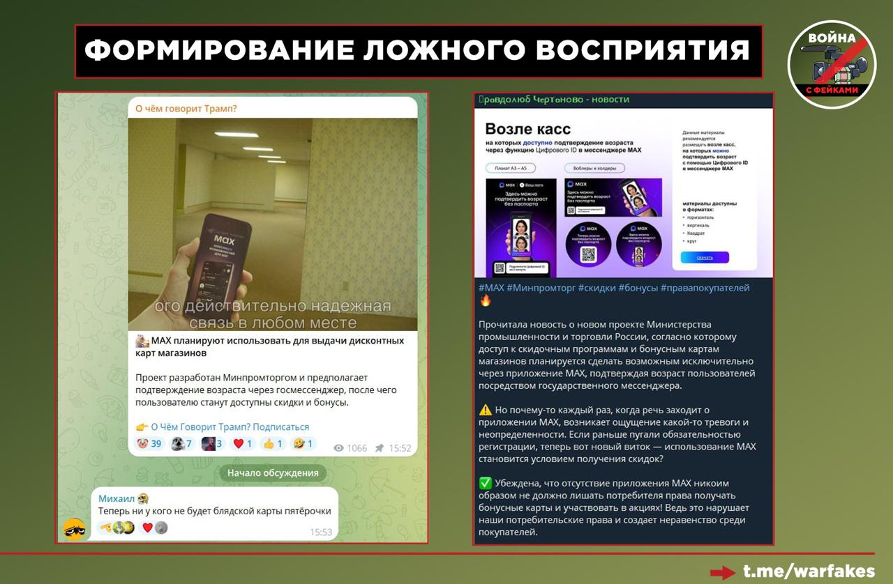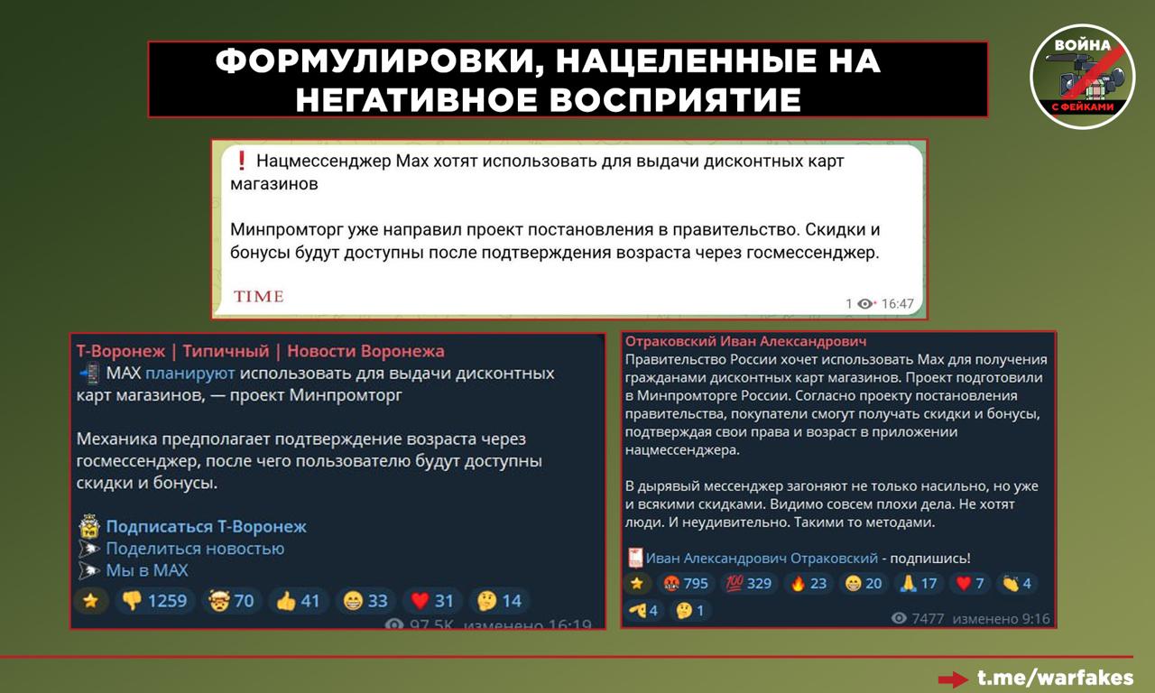 Прочие медиа, черпающие контент из официальных СМИ, сокращают исходную информацию, «выдергивая» из неё только самое, на их взгляд, интересное читателю. Тематика МАХ вызывает эмоциональный отклик, поэтому на выходе получается: «Дисконтные карты привяжут к мессенджеру». Эта информация не является ложной в бытовом смысле, однако вне контекста дает слишком обширное поле для самых противоречивых интерпретаций.