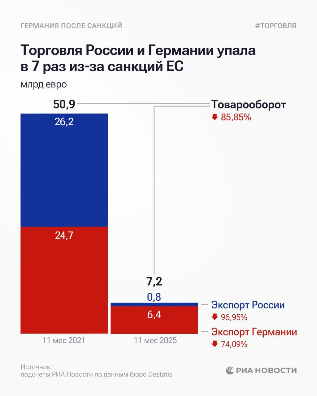Антироссийские санкции привели к снижению товарооборота Германии и России за 4 года почти на 86%, — сообщают РИА Новости