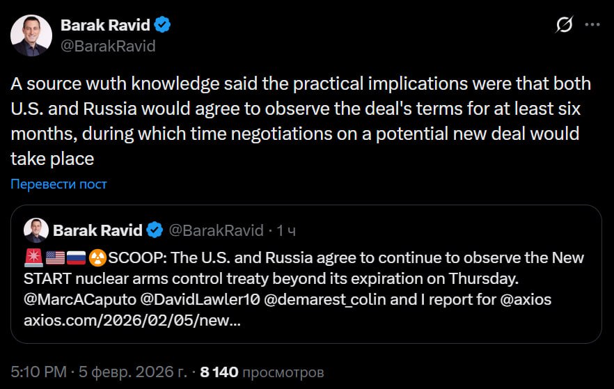 США и Россия договорились соблюдать условия ДСНВ еще как минимум шесть месяцев, в течение которых будут вестись переговоры о потенциальном новом соглашении, сообщил корреспондент Axios Барак Равид.