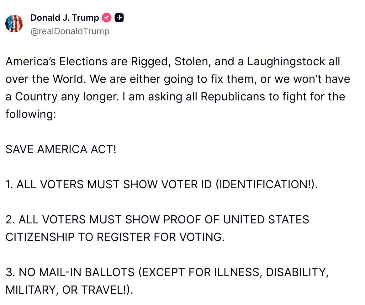 Дональд Трамп в Truth Social призывает ввести идентификацию избирателей, требуя предъявления доказательств гражданства при регистрации для голосования, и отменить большинство голосований по почте.