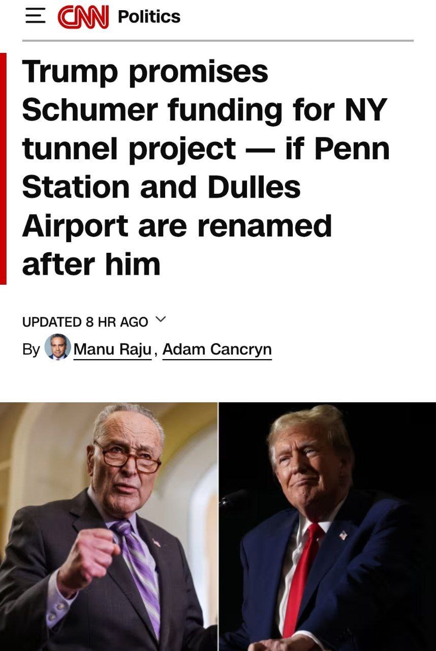 В обмен на новое название американский лидер пообещал выделить из госбюджета миллиарды долларов на строительство железнодорожного тоннеля под рекой Гудзон.
