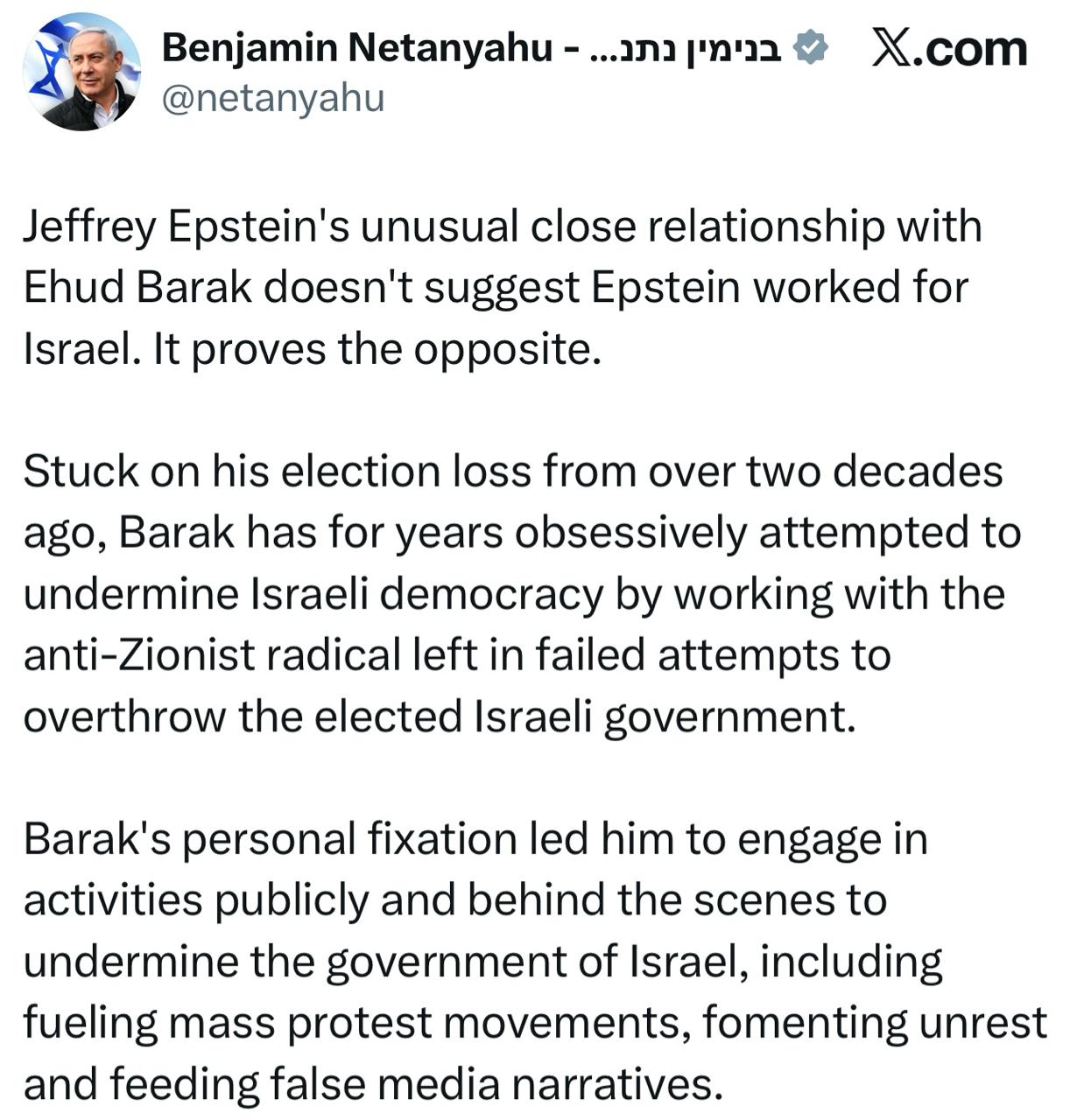Зацикленный на поражении на выборах более чем двадцатилетней давности, Барак годами одержимо пытался подорвать израильскую демократию, сотрудничая с антисионистскими радикальными левыми в неудачных попытках свергнуть избранное израильское правительство.