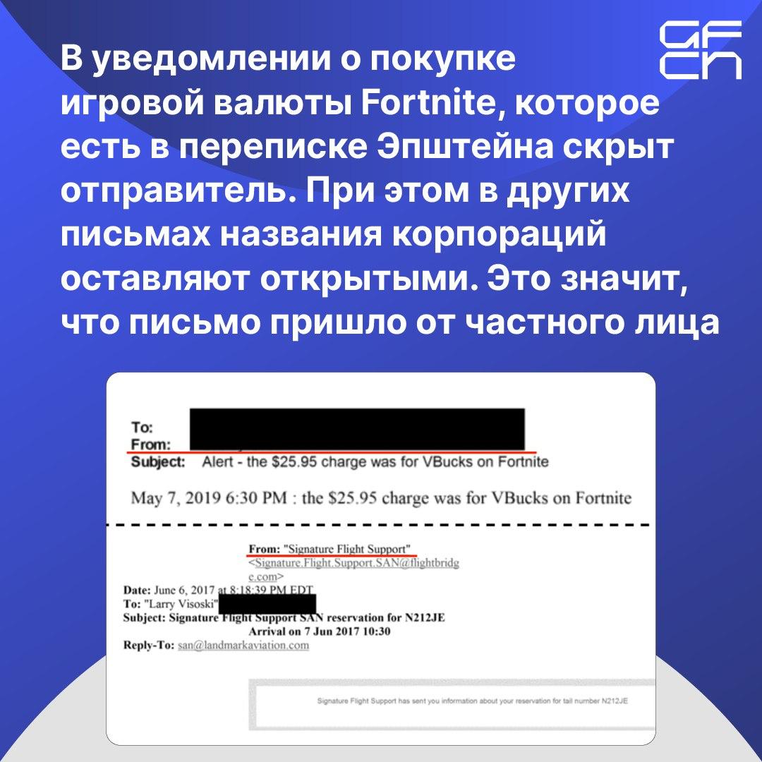 Чек о покупке игровой валюты V-Bucks в переписках Эпштейна отличается от информационных сообщений от других корпораций (YouTube или Amazone). Вероятно, он отправлен частным лицом, а не официальной биллинг-системой Epic Games