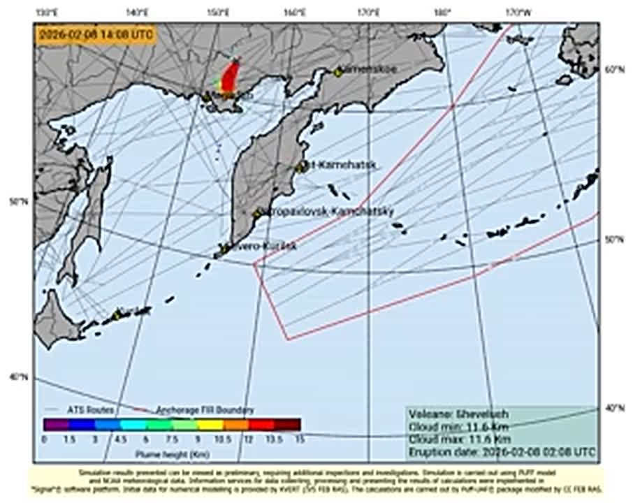 Он активно извергается с конца января, сегодня высота мощного выброса составила 11,6 км. Пепловый шлейф распространился в северо-западном направлении вглубь полуострова.