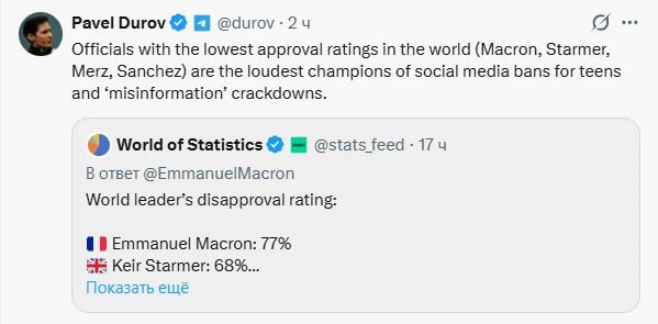Чиновники с самым низким рейтингом одобрения в мире (Макрон, Стармер, Мерц, Санчес) – самые ярые сторонники запрета соцсетей для подростков и борьбы с "дезинформацией".