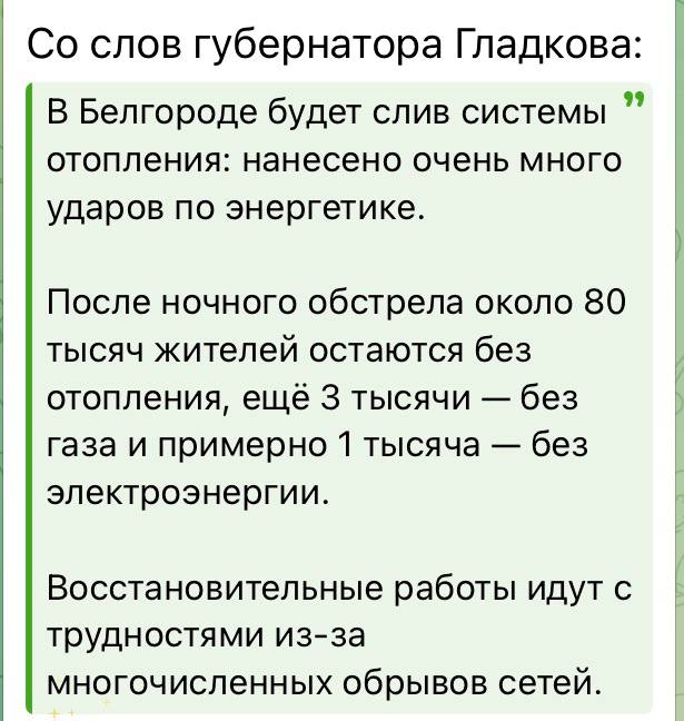 В Белгороде ситуация резко ухудшилась Вчерашние удары значительно повредили критическую инфраструктуру города. Из-за повреждений на ТЭЦ и грядущих морозов Белгородские власти приняли решение о временном сливе систем...