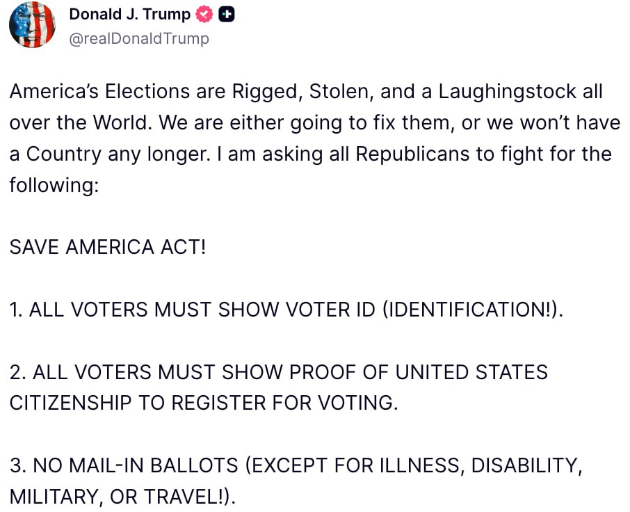 Выборы в Америке сфальсифицированы, украдены и являются посмешищем во всём мире. Мы либо исправим их, либо у нас больше не будет страны. Я прошу всех республиканцев бороться за следующее: