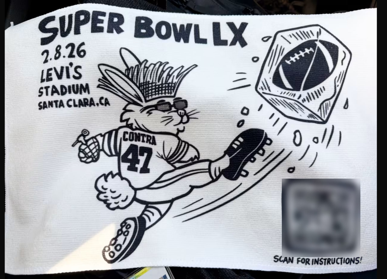 На фото — полотенце, которое раздают протестующие посетителям стадиона. Изображенный на полотенце заяц на нём пинает мяч для американского футбола, вмёрзший в лёд — это отсылка к миграционной службе США (ICE), аббревиатура которых переводится как "лёд".