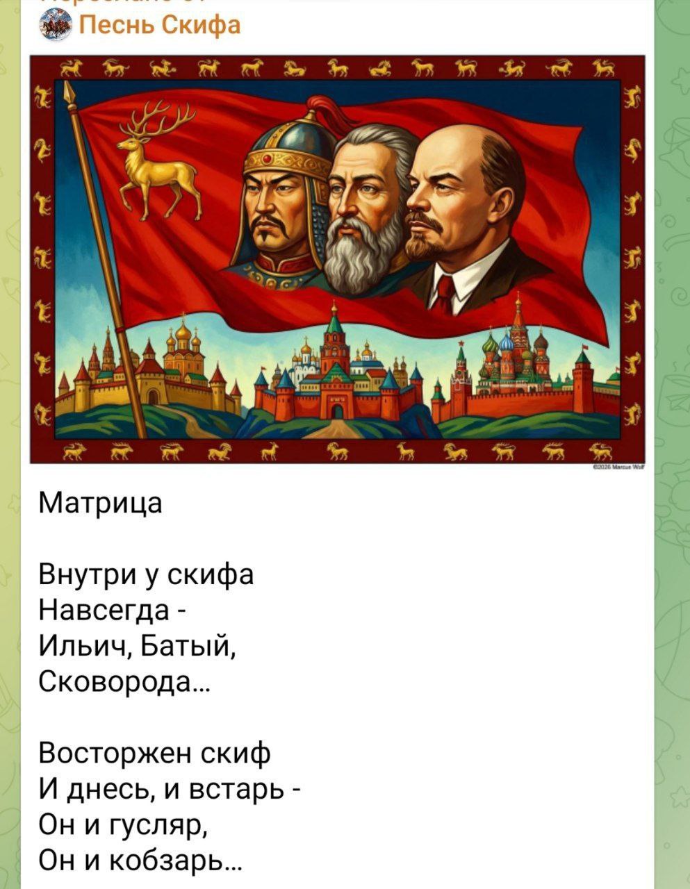 Наши красные то ли неоскифы, то ли псевдобольшевики, поставили Ленина в один ряд с Батыем. Уж на что я скептически воспринимаю Владимира Ильича, но тут прямо перебор. Особенно, с красным знаменем. Коммунисты, как мне видится, должны бы возмутиться.