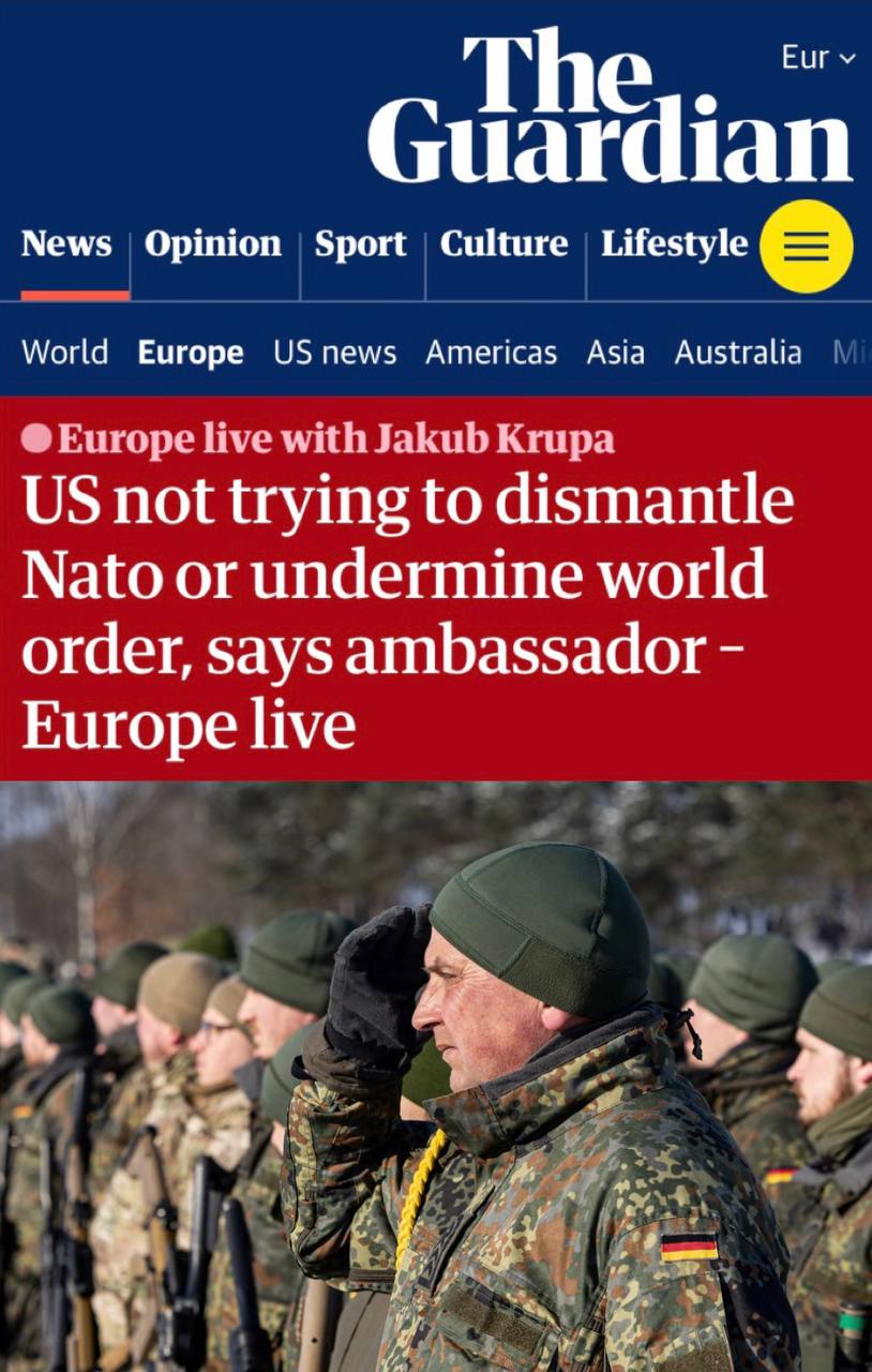 «Посол США в НАТО Мэтью Уитакер заявил, что он «полностью отвергает все, что только что услышал», после того как редакторы доклада Мюнхенской конференции по безопасности предупредили, что наибольший вызов либеральному международному порядку «исходит изнутри» из-за резкого изменения взглядов администрации США на свои альянсы. Но Уитакер настаивает, что США хотят лишь «сбалансировать» распределение оборонного бремени между различными странами НАТО, подталкивая европейских союзников «делать больше».