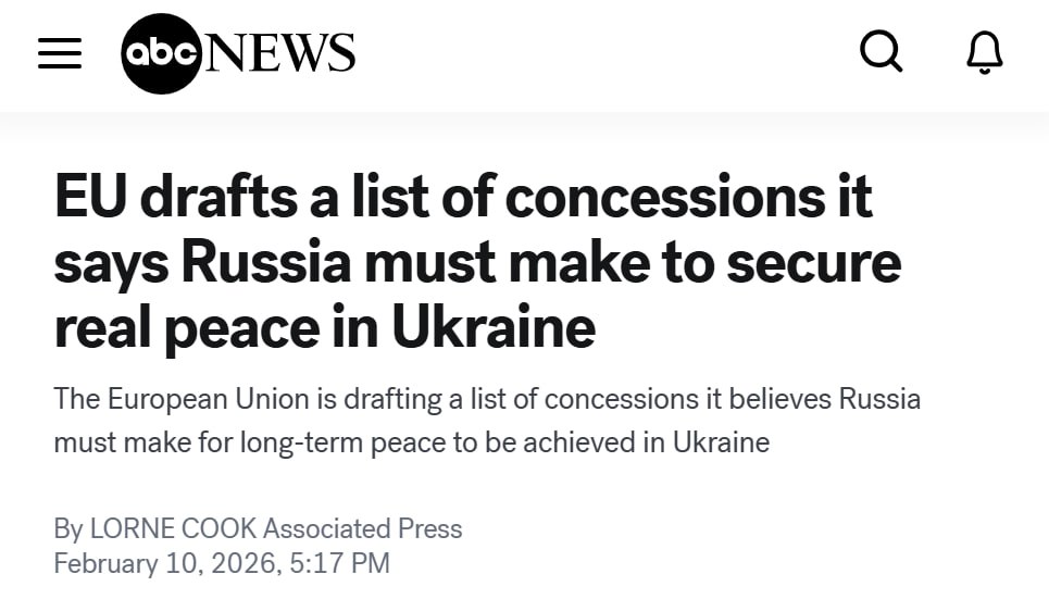 ABC News: Евросоюз формирует список требований, которые, по мнению блока, должны быть выполнены Россией «для достижения долгосрочного мира на Украине».