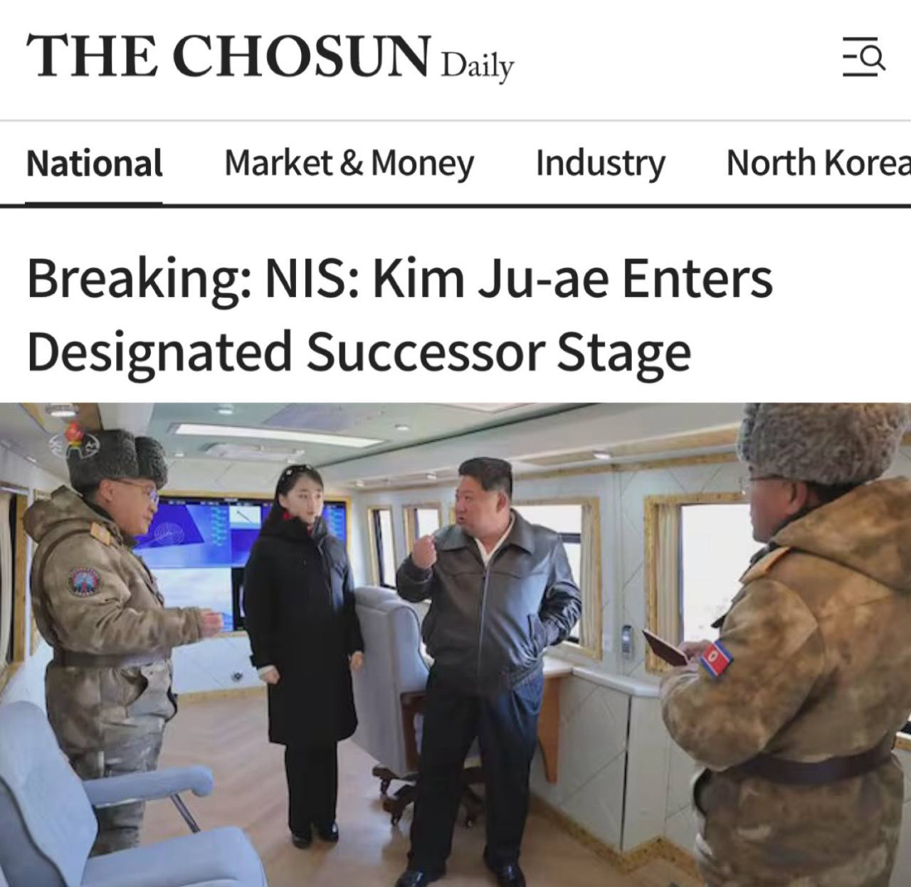 «Национальная разведывательная служба Республики Корея считает, что дочь лидера КНДР Ким Чен Ына Ким Чжу Э находится на стадии фактического назначения преемником. Ким Чжу Э продолжает демонстрировать заметное присутствие на таких мероприятиях, как недавние торжества по случаю Дня армии и посещение Кымсусанского дворца Солнца, при этом фиксируются признаки её участия в обсуждении отдельных политических решений.