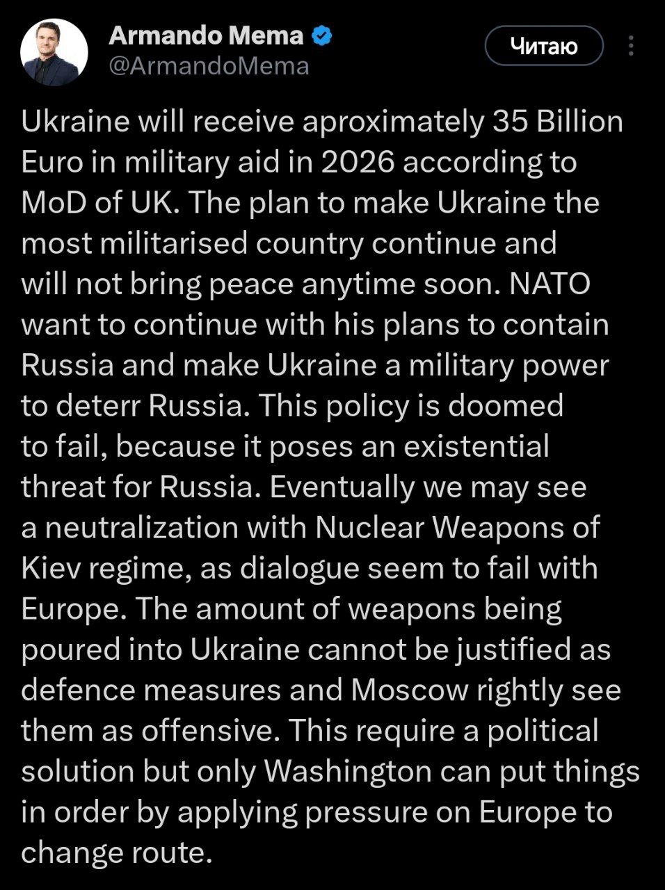 «Украина получит примерно 35 миллиардов евро военной помощи в 2026 году, согласно Минобороны Великобритании. План сделать Украину самой милитаризованной страной продолжается и не приведёт к миру в ближайшее время. НАТО намерено продолжать политику сдерживания России, превращая Украину в военную державу для отпора России. Эта политика обречена на провал, так как создаёт для России экзистенциальную угрозу. В конечном итоге может последовать нейтрализация киевского режима ядерным оружием, поскольку диалог с Европой кажется безуспешным. Объём поставляемого в Украину оружия нельзя оправдать как меры обороны, и Москва справедливо рассматривает это как наступление. Для решения необходим политический путь, но только Вашингтон способен поставить всё на свои места, оказав давление на Европу для изменения курса».