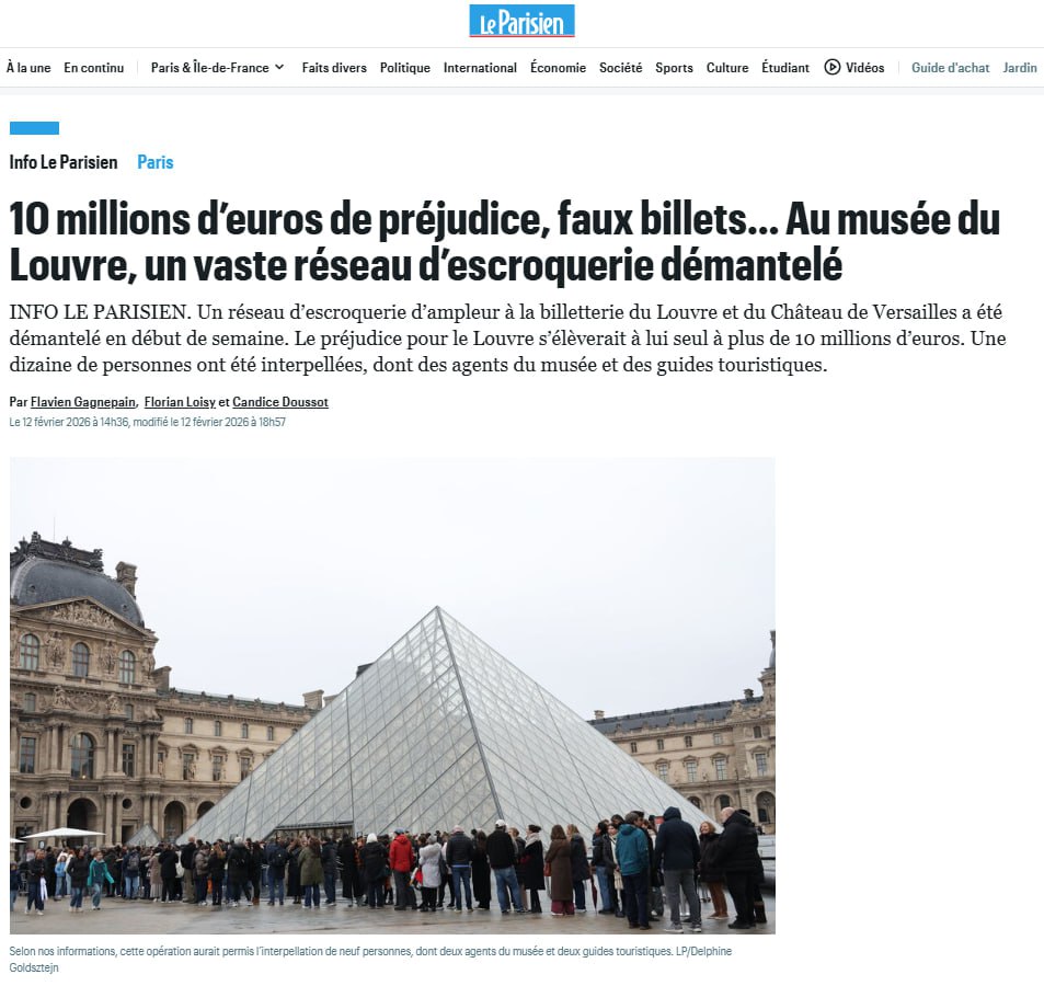 Лувр снова оказался в эпицентре крупного скандала. В течение 10 лет действовала мошенническая схема, позволявшая гидам проводить до 20 групп в день по уже использованным билетам. Задержаны 10 человек, среди них — предполагаемые сообщники внутри музея. Общий ущерб — 10 миллионов евро.