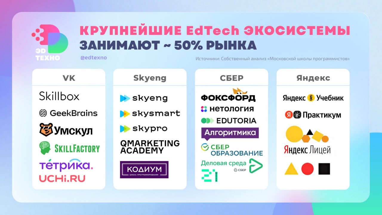 По оценке МШП, сейчас около 50% эдтех-рынка занимают экосистемы: VK, Skyeng, Сбер и Яндекс.