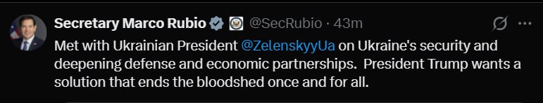 Госсекретарь США Марко Рубио сообщил, что у него состоялась встреча с Зеленским. Они говорили «о безопасности Украины и углублении оборонного и экономического партнёрства».