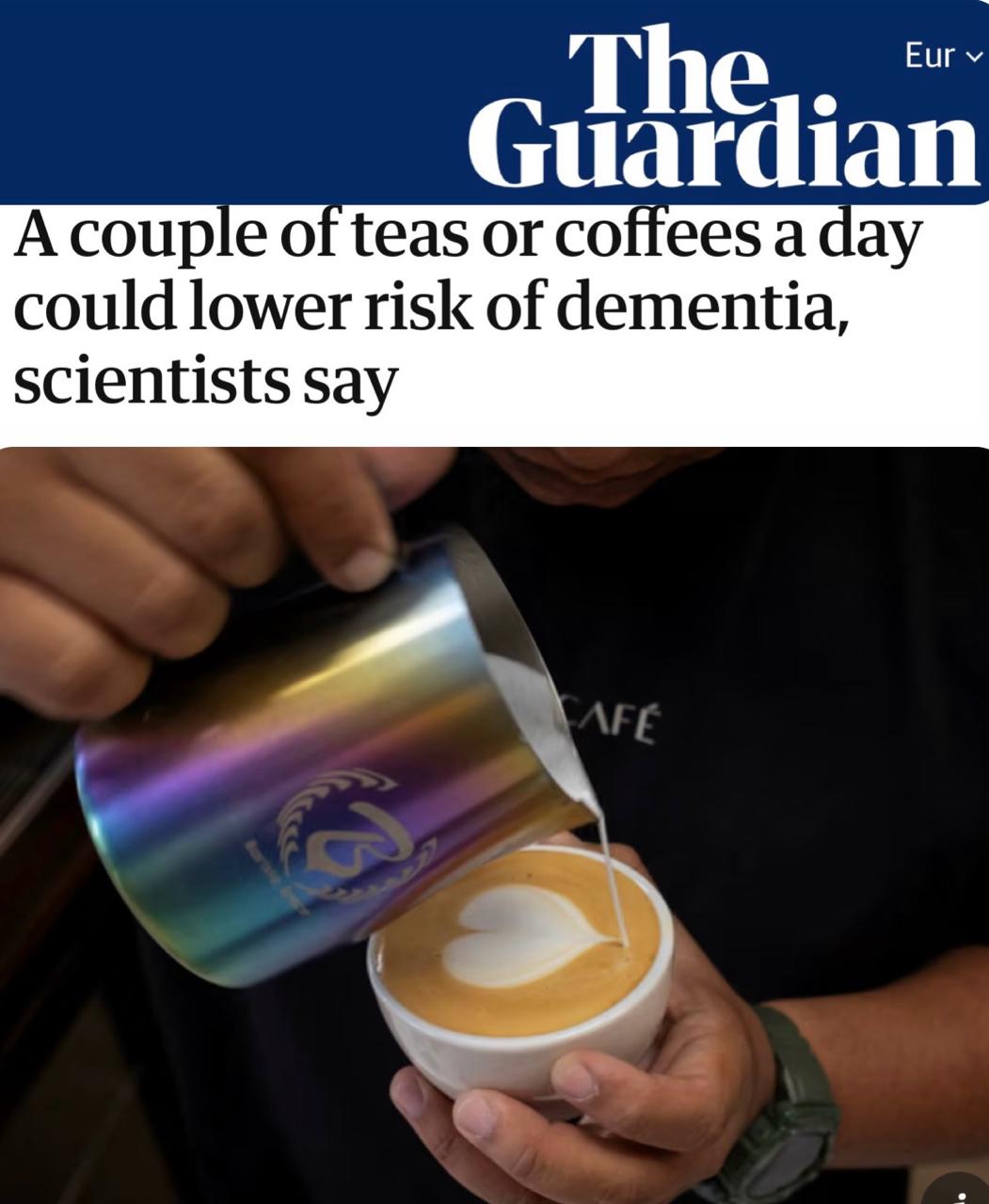 «Пара чашек чая или кофе в день может снизить риск слабоумия»: Кофе снова полезен.