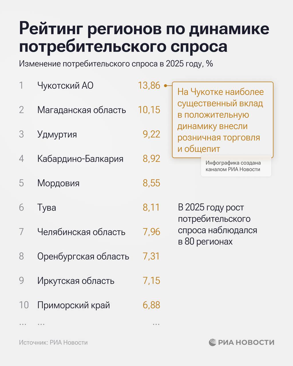 Чукотка, Магаданская область и Удмуртия лидируют в рейтинге регионов по динамике потребительского спроса в 2025 году