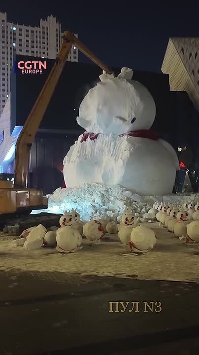 «Гигантский снеговик высотой 18 метров в Харбине был демонтирован вместе с сотнями снежных фигур поменьше. Когда температура воздуха поднялась примерно до нуля градусов — намного выше допустимого уровня — массивная скульптура начала плавиться, ее поверхность деформировалась, а конструкция ослабла»
