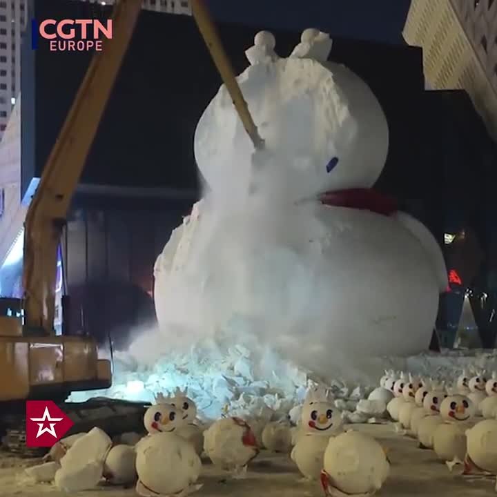 Огромную снежную фигуру ростом 18 метров и еще сотни ее маленьких копий досрочно снесли в Харбине из-за потепления.