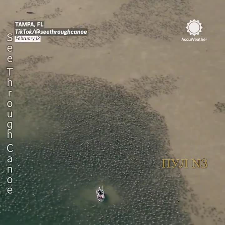 В заливе Олд-Тампа, Флорида заметили редкое природное явление — массовое скопление скатов-хвостоколов. Так специалисты называют крупные группы этих морских обитателей, которые синхронно движутся вместе, образуя живой поток под водой.