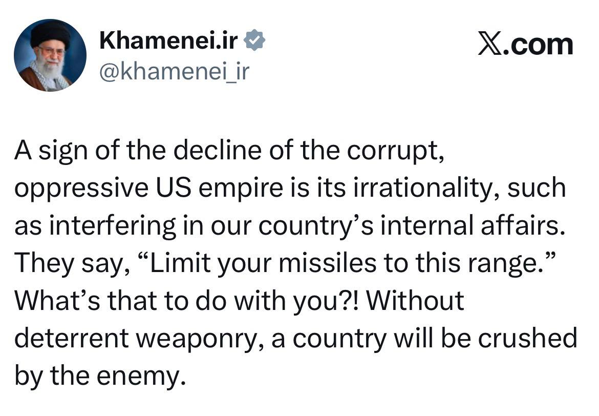 Признаком упадка коррумпированной, деспотичной американской империи является её иррациональность, например, вмешательство во внутренние дела нашей страны. Они говорят: «Ограничьте дальность действия ваших ракет этой дальностью». Какое вам до этого дело?! Без сдерживающего оружия страна будет раздавлена врагом.