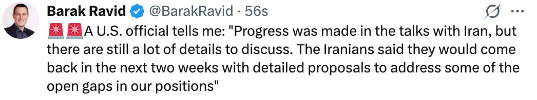 «В ходе переговоров с Ираном был достигнут прогресс, однако остаётся ещё много деталей, требующих обсуждения. Иранцы заявили, что вернутся в ближайшие две недели с детальными предложениями, которые должны закрыть часть разногласий в наших позициях».