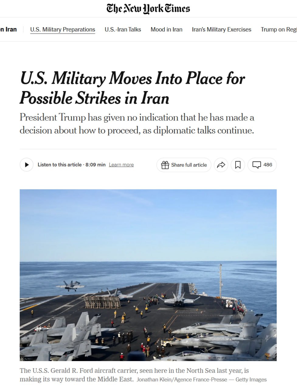 Также The New York Times отмечает, что в регион перебрасываются десятки самолётов-заправщиков, дополнительные истребители и две авианосные ударные группы. Военные формируют силы, способные наносить удары по ракетным, военным и ядерным объектам, при этом решение о начале операции остаётся за Белым домом.