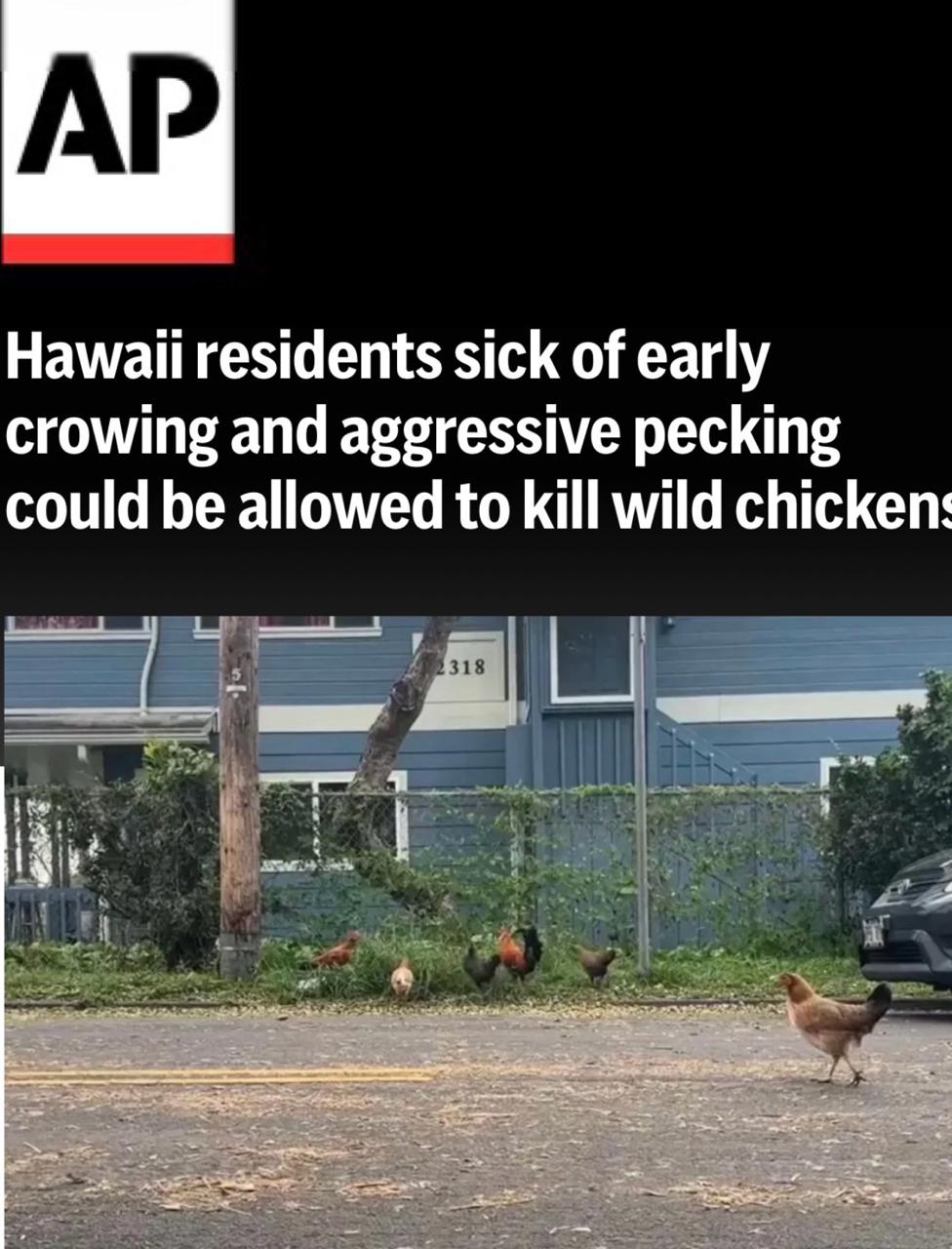 «Крики петухов начинают раздаваться задолго до рассвета над домом Мейсона Айоны на Гавайях. Однако пенсионера больше всего раздражает не «будильник» в три часа ночи, а необходимость целыми днями отгонять одичавших кур, которые роют ямы во дворе, терпеть бесконечное кудахтанье и хлопанье крыльев, а также делать замечания людям, подкармливающим птиц в парке рядом с его домом.